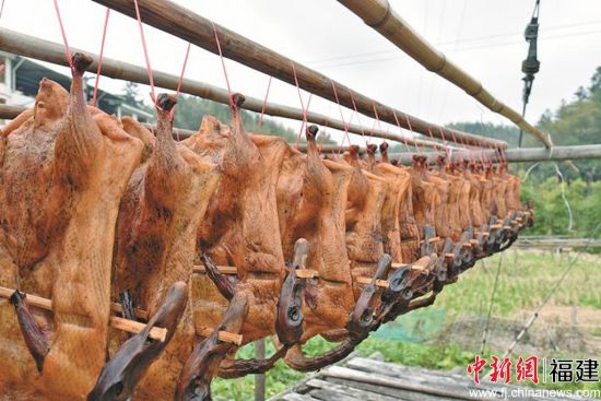 中新网福建新闻1月17日电(许琰)腊月时节,福建省三明市沙县区郑湖乡家家户户开始制作、晾晒板鸭,村头熏烤板鸭的香味飘荡,村道两旁一排排架子上,晒着的板鸭金黄油亮。 郑湖乡杜坑村随...