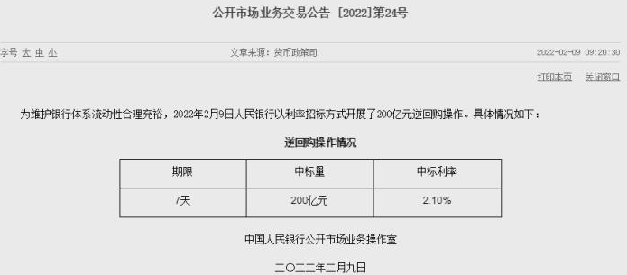 中新财经2月9日电 据央行9日消息,为维护银行体系流动性合理充裕,2022年2月9日人民银行以利率招标方式开展了200亿元7天期逆回购操作,中标利率2.10%,与此前持平。 鉴于9日有2000亿元逆回购到期...