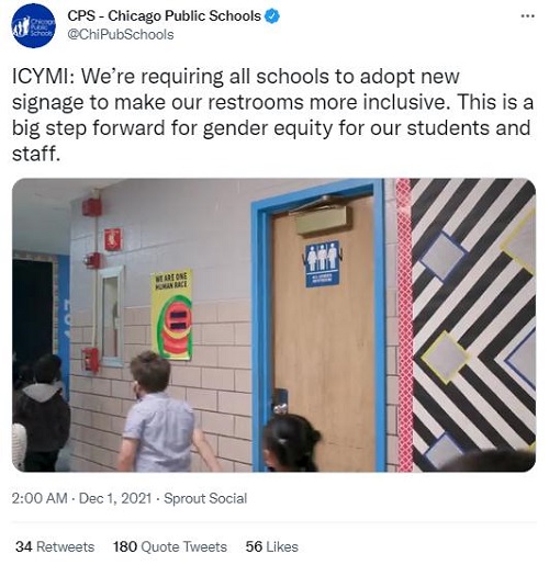 中新网12月3日电 据美媒报道,当地时间12月1日,美国芝加哥公立学校(CPS)在社交媒体发文,强制要求该学区内的所有公立学校取消男女厕所,并将其转变为“全性别厕所”。CPS方面表示,此举是迈向性别平等的一...