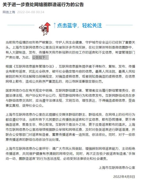 中新网4月8日电 据上海市网信办微信公众号消息,上海市网信办8日发布《关于进一步查处网络圈群造谣行为的公告》(下称“公告”)。公告称,上海市网信办接到市民反映,在社交媒体特别是微信圈群中有人大肆制...