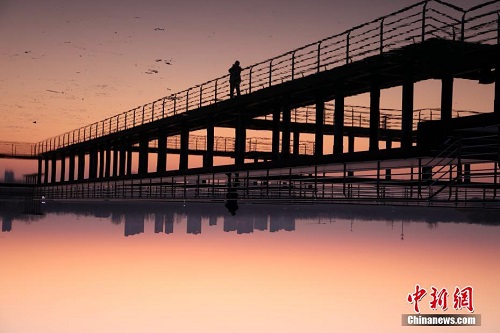 12月6日,市民在山东省滨州市蒲湖公园内徜徉。初冬的清晨,山东省滨州市蒲湖公园的隽秀景致,在晨光映衬下,别具一番韵味。中新社发 初宝瑞 摄 图片来源:CNSPHOTO