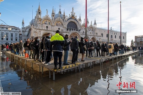 当地时间12月4日,意大利威尼斯,当地水位达到了海平面以上99厘米,城镇部分地区被海潮淹没,人们在被潮水淹没的圣马可广场上架起栈桥。