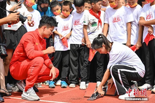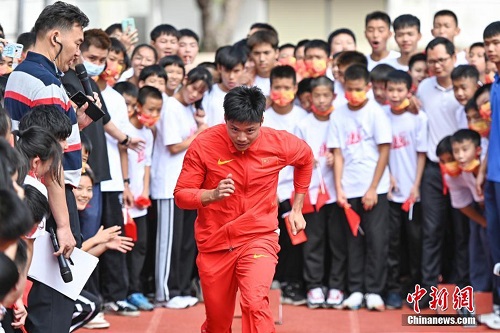10月12日,广东省中山市,苏炳添指导学弟学妹跑步技巧。当日,苏炳添现身中山,回到母校——中山市体育运动学校参加欢迎会并现场教学跑步技巧。 中新社记者 陈骥旻 摄