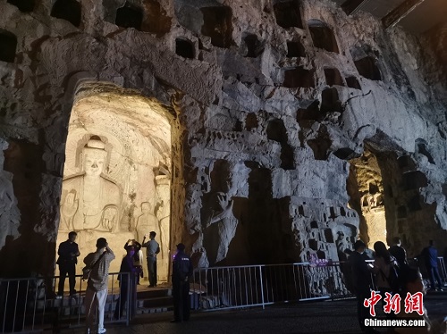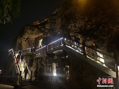 10月14日晚,夜幕下的河南洛阳龙门石窟在连绵灯光的衬托下蔚为壮观、神秘莫测,吸引游人山间夜游。图为游客在佛像前拍照留影。 中新社记者 刘鹏 摄