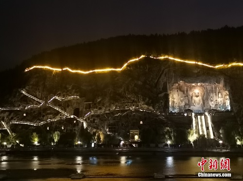 河南洛阳龙门石窟夜景 蔚为壮观神秘莫测