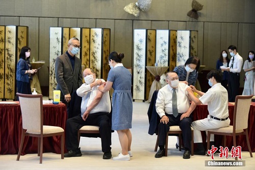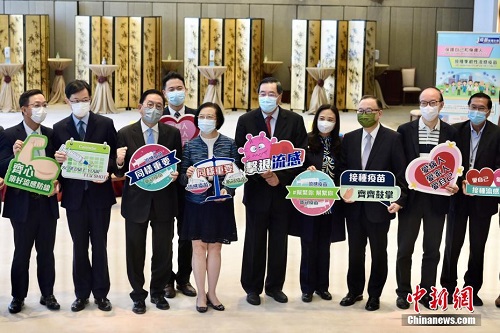 10月20日上午,香港特区立法会进行接种季节性流感疫苗活动,立法会主席及各议员一起接种季节性流感疫苗,并呼吁市民积极接种疫苗对抗流感。图为特区政府食物及卫生局局长陈肇始(左五)、立法会主席梁君彦(右五)及各议员呼吁市民接种流感疫苗。 中新社记者 李志华 摄