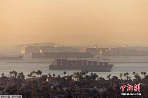 资料图:当地时间9月22日,美国加州,洛杉矶和长滩港口创纪录拥堵,多艘货船排队等待通行。