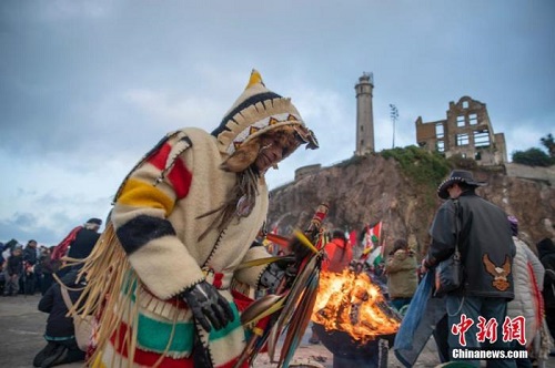 当地时间2019年11月28日,一年一度的美洲原住民感恩节日出仪式在美国旧金山“恶魔岛”(阿尔卡特拉斯岛)举行。中新社记者 刘关关 摄