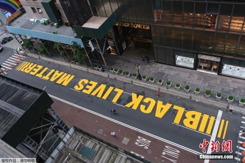 在美国纽约第五大道特朗普大厦前的路面上涂写的“黑人的命也是命”的标语。