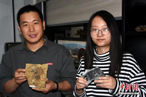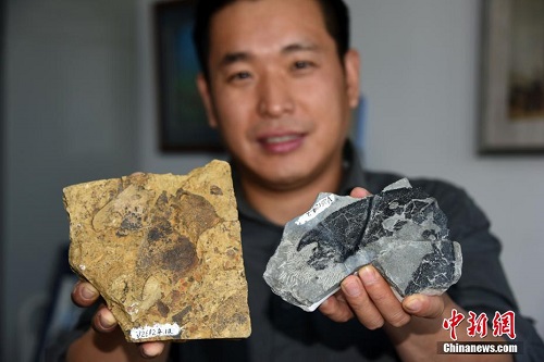 10月27日,记者从中国科学院古脊椎动物与古人类研究所获悉,该所科研团队在采自“古鱼王国”云南曲靖的盔甲鱼类化石材料中,梳理发现一件4.2亿年前最大真盔甲鱼类——漫游憨鱼化石,并和新发现的另一件化石一起,最新研究揭示其具有现生魔鬼鱼一样的腹面鳃孔(也称外鳃孔),为探讨盔甲鱼类的生活习性及演化提供了重要资料。图为10月26日下午,论文通讯作者、中科院古脊椎所副研究员盖志琨在北京展示两件漫游憨鱼新化石材料。 中新社记者 孙自法 摄