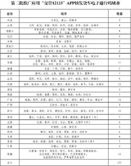 中新网北京10月29日电 (记者 郭超凯)记者29日从公安部交通管理局获悉,自2021年11月1日起,在全国第一批70个城市推广应用的基础上,石家庄、杭州、成都等175个城市第二批推行网上核发货车电子通行码,货车驾驶人或管理员可以通过“交管12123”APP快速查询推广应用城市的货车禁限行和通行码申领规定,按需申领和便捷出示货车电子通行码。