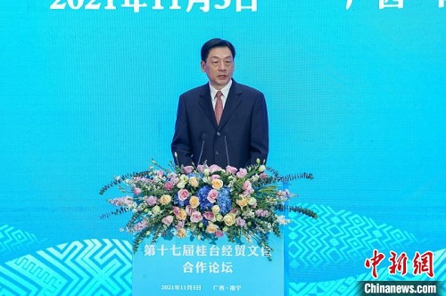 中新网南宁11月3日电(蒋雪林 汤锋年 许耀艺)11月3日,以“深化交流合作共赢”为主题的第十七届桂台经贸文化合作论坛在广西南宁开幕。