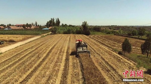 资料图:农民开收割机收割小麦。 宗瑛 摄