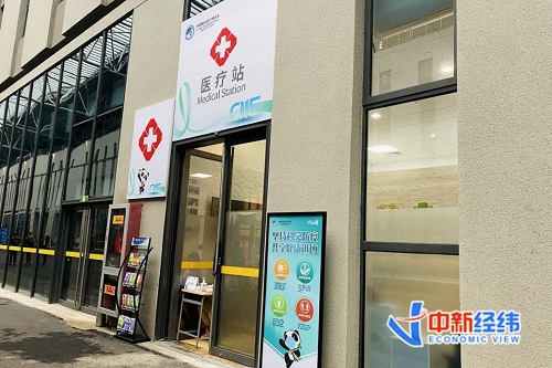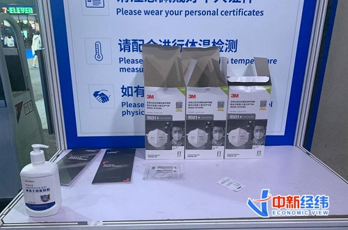 此外,我们每天都在展馆与新闻中心之间暴走,在背着电脑日行几万步采访的过程中,经常一抬头就能看到志愿者高举“请佩戴口罩、请保持安全社交距离”的牌子,并提醒人群勿扎堆。防疫物资取用点、医疗站随处可见,也不时能见到进行消杀作业的工作人员。