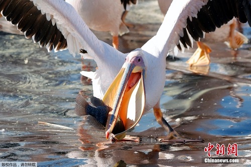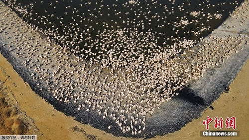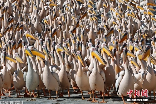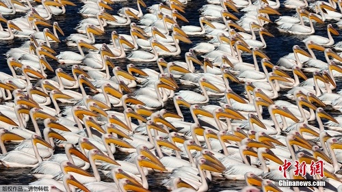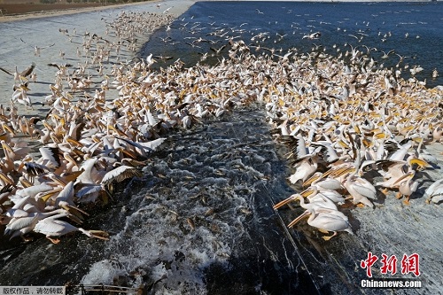 当地时间2021年11月8日,以色列特拉维夫市北部,白鹈鹕飞往此处过冬,户外商业池塘和水库为其提供了丰富的食物,由于数量过多给当地的养鱼户带来了困扰。
