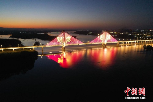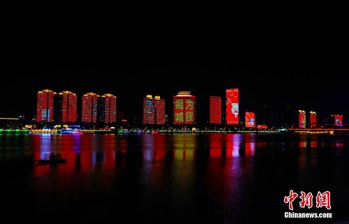 11月9日晚,湖北省襄阳市举办“火焰蓝”消防主题灯光秀活动。当天是“全国消防日”,襄阳汉江两岸标志性建筑整体被点亮,文字及图案融入古城夜景。张岩岩 摄