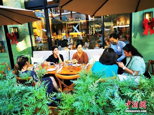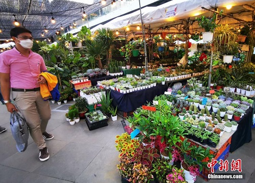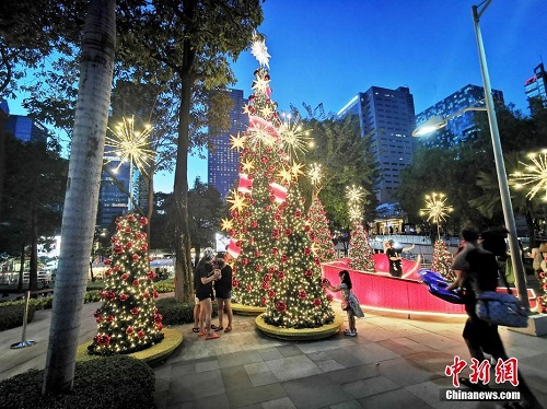 11月9日,进入2级防疫警戒的菲律宾首都大马尼拉地区BGC新城高街商圈,圣诞装置吸引市民观赏。当天,菲律宾国家统计局发布的数据显示,今年第三季度菲国内生产总值(GDP)同比增长7.1%,高于预期,其中服务业增长8.2%。 中新社记者 关向东 摄
