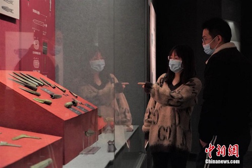 11月16日,贵州省贵阳市,参观者观赏展品。当日,“多元一体入华夏:会稽与牂柯青铜文物展”在贵州省博物馆开展。本次展览展出江苏镇江博物馆藏吴地青铜文物154件(套)和贵州省博物馆藏青铜器精品50件(套),展示了商周至战国秦汉时期,地处华夏边缘的会稽和牂柯故地先民,在吸收中原青铜技艺后,形成各自特色的青铜文化魅力。 中新社记者 蒲文思 摄