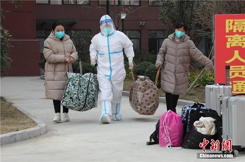 11月17日,在集中隔离点经最后一次核酸检测结果全部阴性后,河南省扶沟县846名被转移异地隔离的中学生全部解除隔离踏上了返乡路。本月8日,扶沟县一天内新增5例无症状感染者,均为该县实验中学学生。当晚,学校846名学生被连夜闭环转运到周边的西华、太康、淮阳、郸城等8个县市区进行隔离隔离观察。目前,返程学生们已返回家中并开启7天健康监测。图为医务人员带领学生走出隔离点。 刘鹏 摄