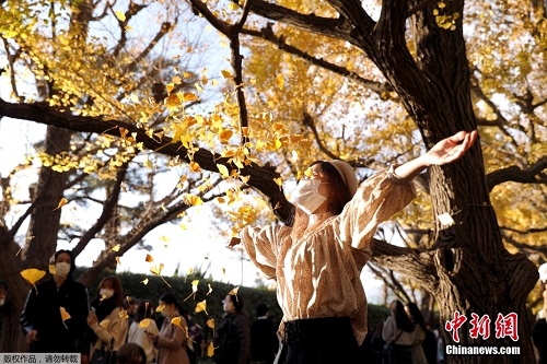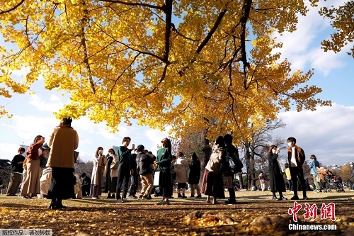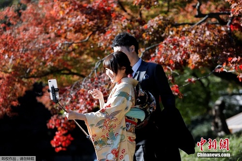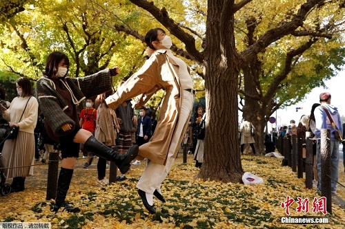 当地时间11月23日,日本东京秋色浓郁,民众户外拍照散步享受大自然的馈赠。