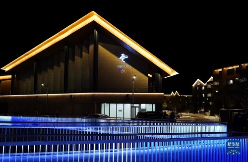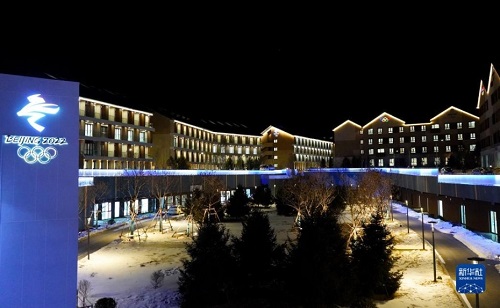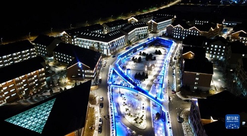 这是11月23日拍摄的张家口冬奥村夜景(无人机照片)。当日,2022年北京冬奥会张家口冬奥村(冬残奥村)开展了首场常规用电负荷测试暨亮灯仪式。张家口冬奥村(冬残奥村)位于崇礼冬奥核心区的中心位置,地上建筑面积约13.5万平方米,地下面积约10.3万平方米。此次测试覆盖村内各区域,对31栋运动员公寓楼和广场区22个商业空间的灯管进行满负荷压力检测。 新华社记者 金皓原 摄