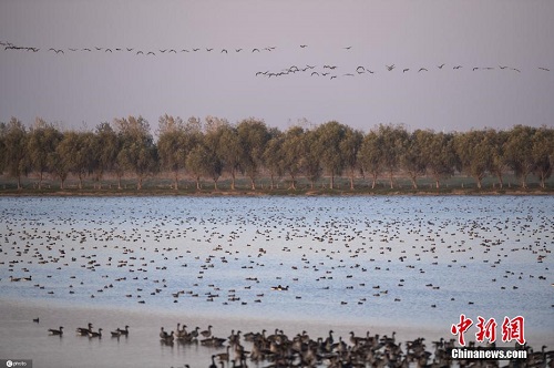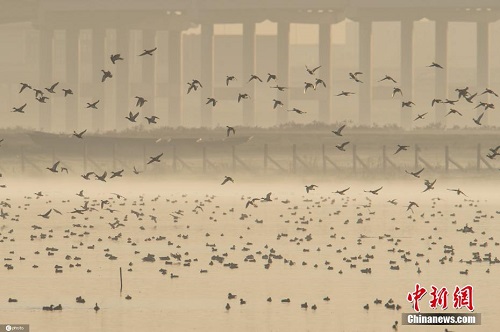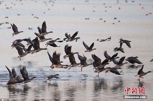 11月24日,湖北武汉,跨越4000公里,从遥远的西伯利亚跨山越海飞到武汉。每年10月末至11月初,武汉东西湖区柏泉街的府河天鹅湖就会迎来北方的候鸟朋友。平静的湖面热闹起来,清脆的鸟鸣划破天空。 图片来源:ICphoto