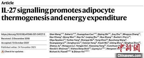 相关研究论文于11月24日在国际顶级学术期刊英国《自然》(Nature)杂志在线发表。论文题目为“IL—27 signaling promotes adipocyte thermogenesis and energy expenditure”。该项研究突破了对白细胞介素IL—27仅专注于调节免疫系统的传统认知。尹芝南教授为该论文的最后通讯作者,耶鲁大学Richard A Flavell教授、暨南大学医学部生物医学转化研究院副研究员杨恒文,及暨南大学附属珠海市人民医院教授陆骊工为该论文的共同通讯作者。暨南大学附属珠海市人民医院博士后王倩、博士后李德海、暨南大学医学部生物医学转化研究院副研究员曹广超,及暨南大学附属第一医院副教授石绮屏为共同第一作者。