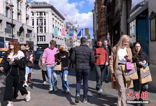 资料图:当地时间4月12日,英国第三次全国性疫情封锁进入“解封”的第二阶段,非必需品商店、餐馆、酒吧、理发店和健身房等商业机构,经历了近三个月的关闭后,重新开业引来“消费潮”。图为伦敦市商业中心牛津街上人流涌动。中新社发 张梦琪 摄