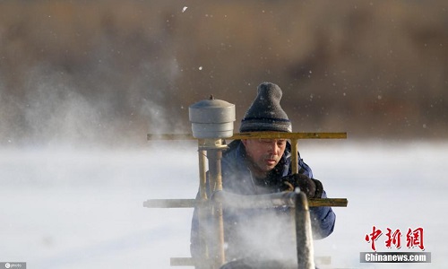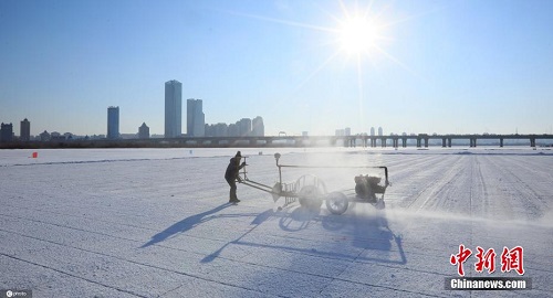 12月4日,黑龙江省哈尔滨市,松花江上的采冰工作已经启动,工作人员在江面用切割机横、竖切割,一块块采冰场地,满是规整的横竖线条。工人会沿着这些横竖切割线,把冰切开,运到冰雪大世界等用冰场地,建设冰景。图片来源:ICphoto