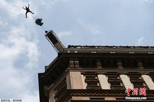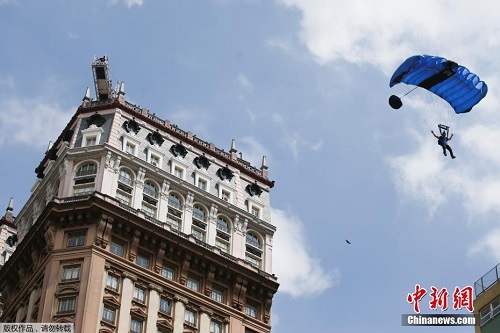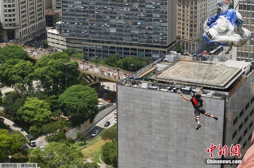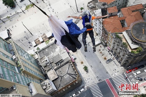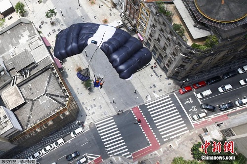 当地时间12月4日,巴西圣保罗,当地举行低空跳伞赛,参加的选手从马蒂内利大厦一跃而下,场面惊险刺激。
