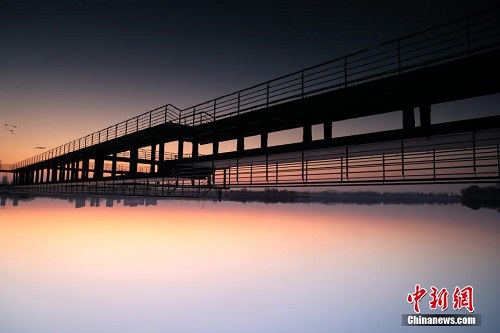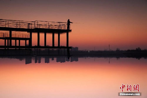 12月6日,市民在山东省滨州市蒲湖公园内徜徉。初冬的清晨,山东省滨州市蒲湖公园的隽秀景致,在晨光映衬下,别具一番韵味。中新社发 初宝瑞 摄 图片来源:CNSPHOTO