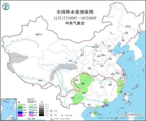 全国降水量预报图(12月16日8时-17日8时)