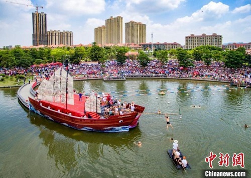 水上“掠鸭”是深受泉州当地群众欢迎的水上竞技运动,图为水上“掠鸭”项目现场。 泉州市体育局 供图