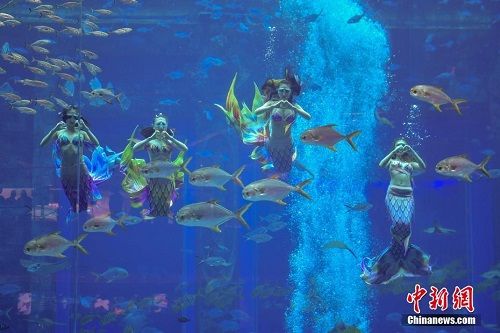 12月21日,首届中国美人鱼表演赛在海南三亚开赛。据了解,本次表演赛设有男子单人、女子单人和四人团体三个项目,共有41名选手参加个人组与团体组的比赛。图为参加团体项目的选手正在比赛中。 中新社记者 骆云飞 摄