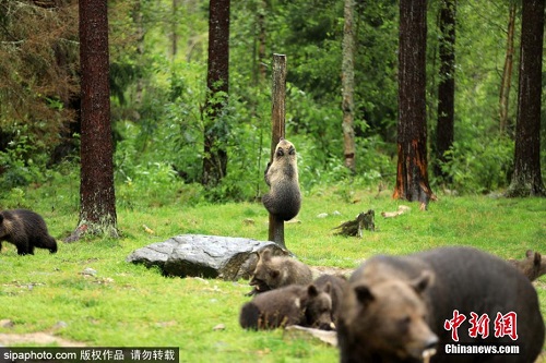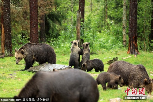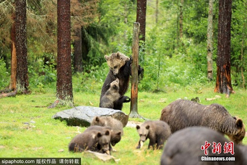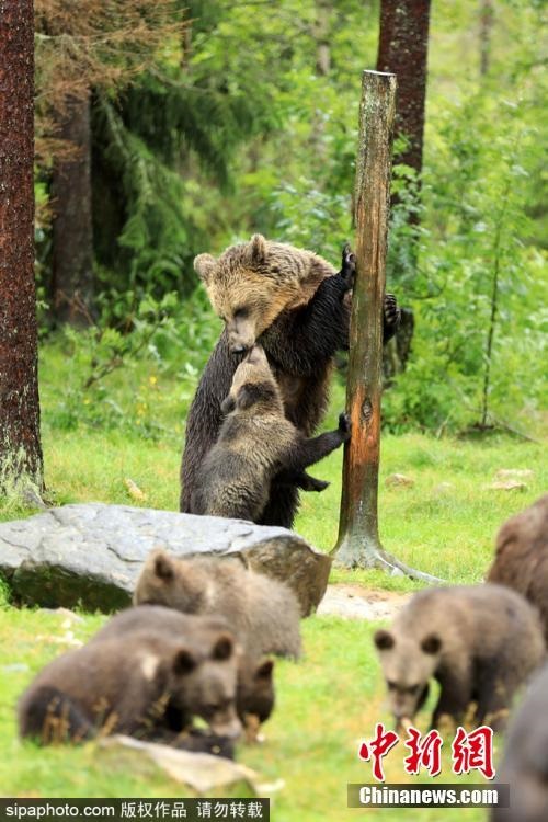 近日,芬兰马丁塞尔科宁,摄影师Valtteri Mulkahainen拍摄到的大熊在森林中教小熊们爬树的有爱瞬间。当时熊群正在树林中休息,几只小熊在一个矮树桩旁练习爬树,大熊看到后走过去,开始教它们爬树。 图片来源:Sipaphoto