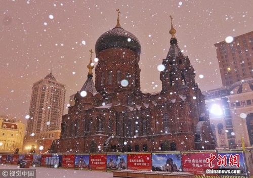 雪中的哈尔滨索菲亚教堂。 图片来源:视觉中国