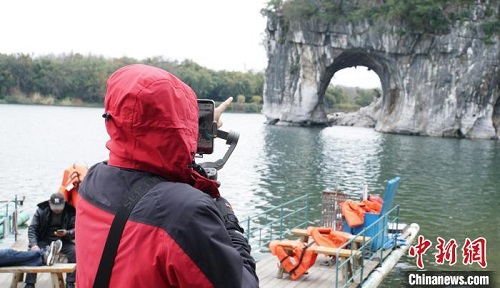 1月31日,广西桂林市象鼻山景区免费开放,主播在景区进行直播。 蒋丰慧 摄
