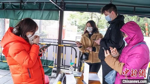 1月31日,广西桂林市象鼻山景区门口,游客们根据工作人员指示扫码入园。 蒋丰慧 摄