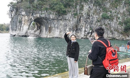 1月31日,游客站在象鼻山前拍照。 蒋丰慧 摄