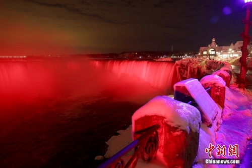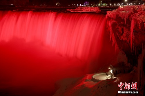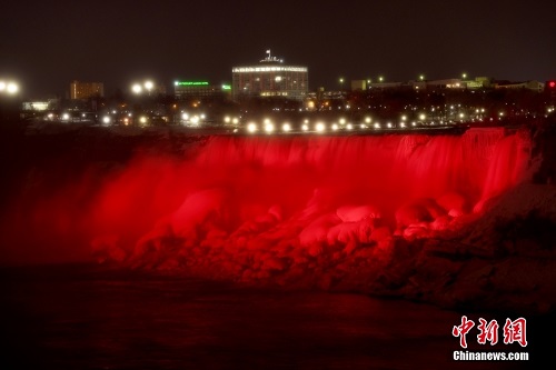 当地时间2月1日农历正月初一晚,加拿大著名旅游景点尼亚加拉大瀑布用灯光点亮“中国红”,庆祝中国农历虎年春节。 中新社记者 余瑞冬 摄