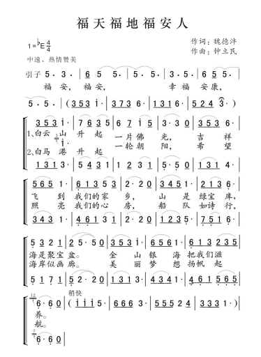 为贯彻落实省委、省政府关于加快打造福建文化标识体系、打响福建“福”文化品牌的决策部署,福安市广大文艺工作者,创作了一批“关注‘福’文化、参与‘福’文化、乐享‘福’文化、发展‘福’文化”的文艺作品,现推出由魏德泮作词,钟立民作曲,“福”文化主题歌曲《福天福地福安人》,营造“福星高照、福佑中华”的祥和氛围。