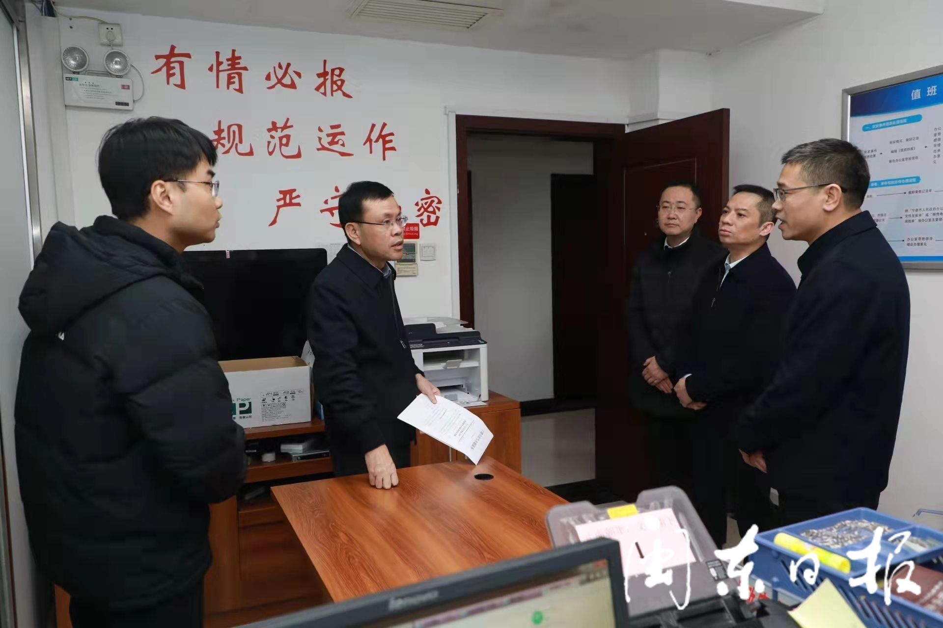 张永宁先后来到市公安局东侨分局巡特警反恐大队市委市政府执勤点、五里亭派出所市委市政府大院警务室、市委市政府门岗、市政府总值班室,看望慰问值班在岗人员,详细询问各个岗位值班值守、装备设施配备等情况。他说,春节期间,大家坚守岗位、尽职尽责,为守护一方平安稳定付出了辛勤的劳动,向大家表示感谢。他强调,要严格落实中央和省里关于做好春节期间有关工作的具体要求,加强值班值守,健全协调联动机制,确保信息报送及时准确、综合协调快捷高效、检查督促有力有效;要认真做好应急准备,提高防范和应对重大突发事件能力,确保让人民群众过上一个平安祥和的新春佳节。