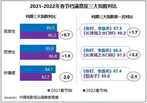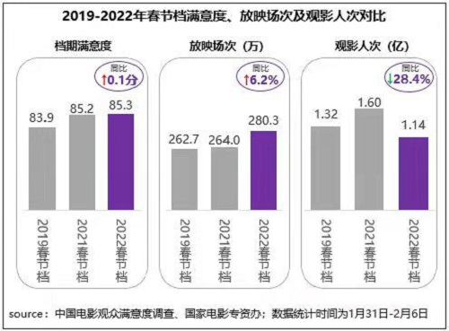 中国电影资料馆日前发布的中国电影观众满意度调查 2022年春节档调查结果显示,春节档观众满意度得分85.3分,同比增长0.1分,为2015年开始调查以来同档期最高分。