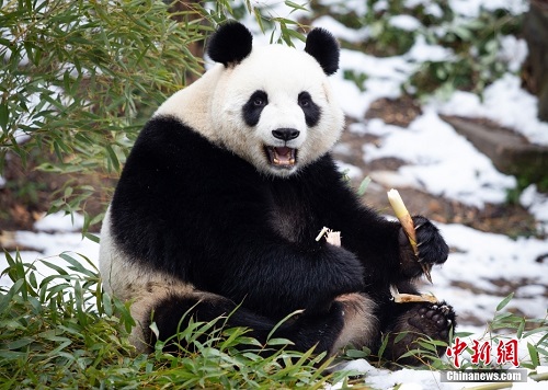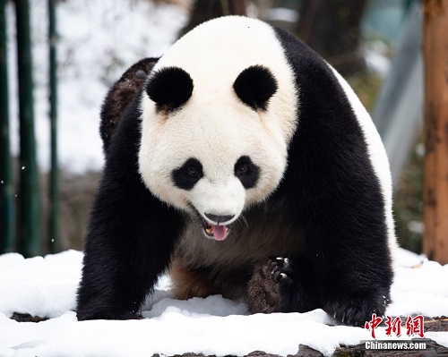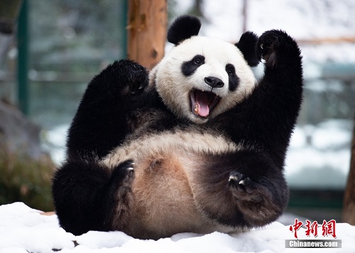 2月8日,雪后的南京红山森林动物园银装素裹,大熊猫在雪地里嬉戏玩耍,享受“戏”雪的快乐。图片来源:视觉中国