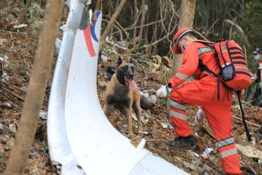 3月22日,在广西梧州藤县东航MU5735航班坠机事故现场核心区,武警广西总队官兵利用警犬协助搜索。新华社发(江怀鹏 摄)