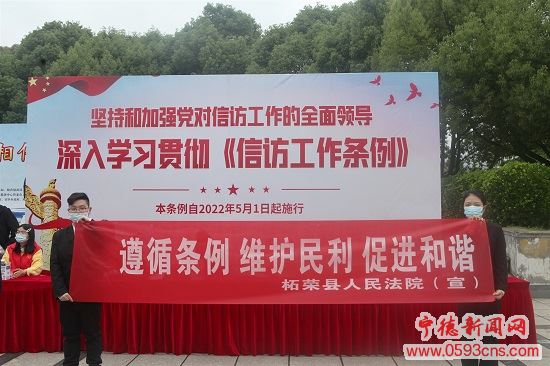 5月25日,柘荣法院与县信访局一同开展以“遵循条例维护民利促进和谐”为主题的《信访工作条例》宣传活动,向群众发放《信访工作条例》宣传材料100余份,解答群众问题60余次,详细为群众解读《信访工作条例》中的各类信访事项提出、受理、办理的形式、渠道、程序和方式。(文/图 卢怡航)