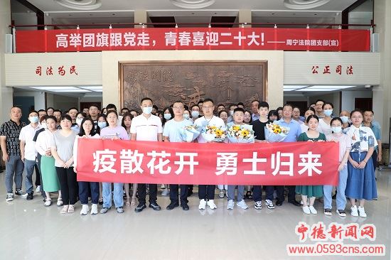宁德新闻网7月22日电(郑树泉)“欢迎回家!你们辛苦了!”7月20日,在经过数个日夜的“疫”线奋战坚守与集中隔离后,宁德市周宁县人民法院支援霞浦抗疫英雄圆满完成任务,重回工作岗位。周宁法院党组书记、院长陈立峰带领全院干警,向他们献上鲜花和热烈的掌声,欢迎抗疫英雄凯旋而归。