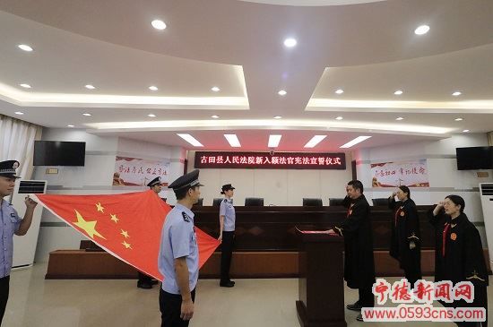 为进一步增强人民法官职业使命感、责任感和荣誉感,古田法院近日举行新入额法官宪法宣誓仪式,2名新入额法官在审判委员会专职委员陈能容的带领下,面对国旗,庄严宣誓。(文/图 李娴)