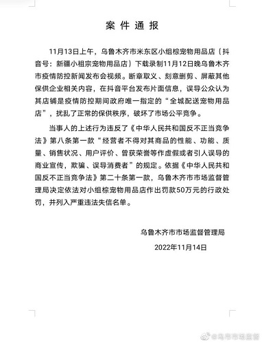 中新网11月14日电 14日,乌鲁木齐市市场监督管理局官方微博通报,小组棕宠物用品店罚款50万元,并列入严重违法失信名单。该企业为了宣传自身,下载录制疫情防控新闻发布会视频,发布片面信息,误导公众认为其店铺是疫情期间政府唯一指定的“全城配送宠物用品店”,扰乱了正常的保供秩序,破坏了市场公平竞争。(中新财经)