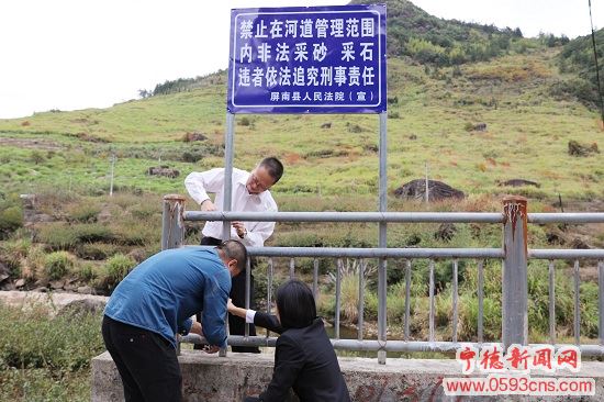 日前,屏南法院生态环境审判团队一行前往代溪镇,与县水利局联合开展霍童溪流域生态司法保护行动。此次行动是该院依托霍童溪生态司法保护工作联络点,在霍童溪流域设置提示牌,禁止在河道管理范围内非法采砂、采石,禁止电鱼、毒鱼非法养殖捕捞等违法行为,司法助力霍童溪流域生态保护和高质量发展。(文/图 屏法)